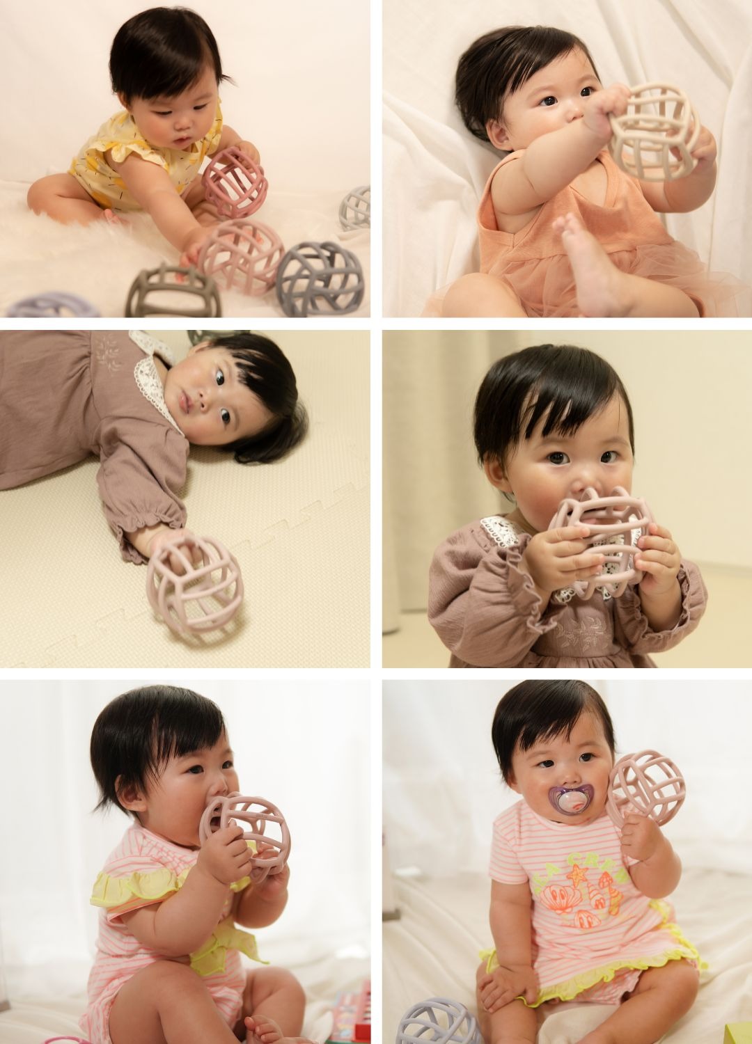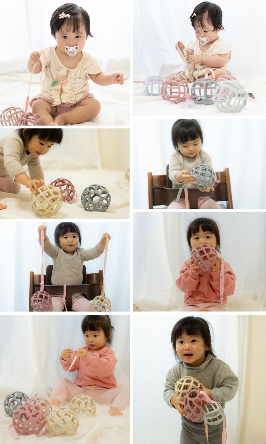 新生児から使えるおもちゃベビーシリコンボールとストラップ。3ヶ月くらいから目で追いかけて、興味を持ち出します。