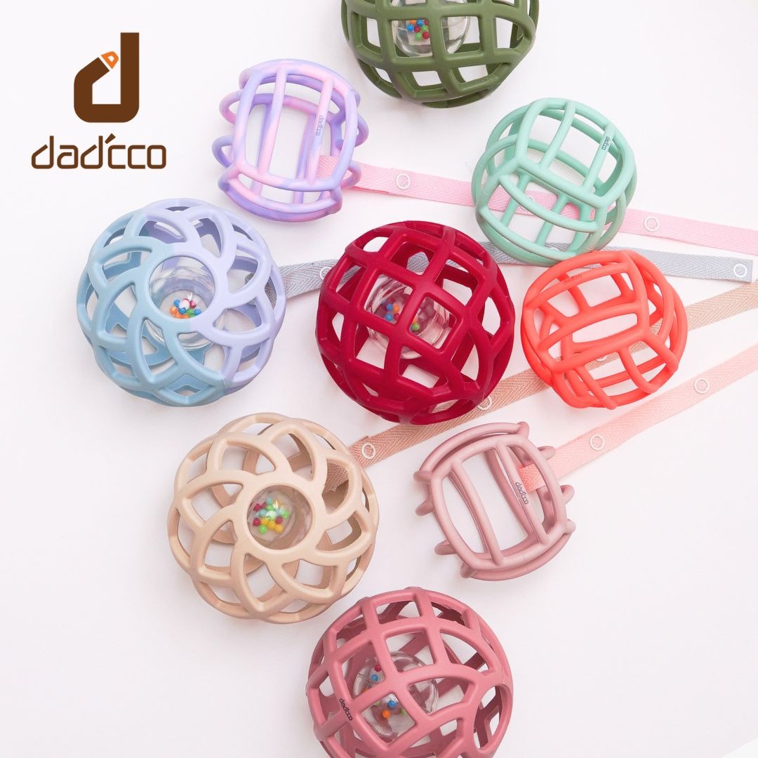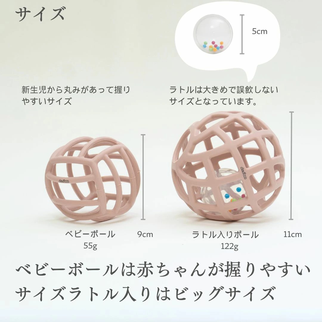 新生児からの赤ちゃんおもちゃ ダディッコオリジナルのベビーボールとトイストラップのセットです。0歳 3ヶ月くらいの新生児から反応するシリコン製の玉転がしベビーボール。ダディッコで人気のおもちゃストラップ。オーボールラトルとは違い、くすみカラーが可愛い。とても柔らかいので新生児にも安心。歯固めにもなります。ベビーが気になるあみあみボールです。ベビーカーやチャイルドシート、メリーにも引っ掛けておでかけにも室内にも、車でも使えます。ボールは知育玩具や歯固めとしてもOK。食品衛生レベルの認証を受けているのでなめても安心です。