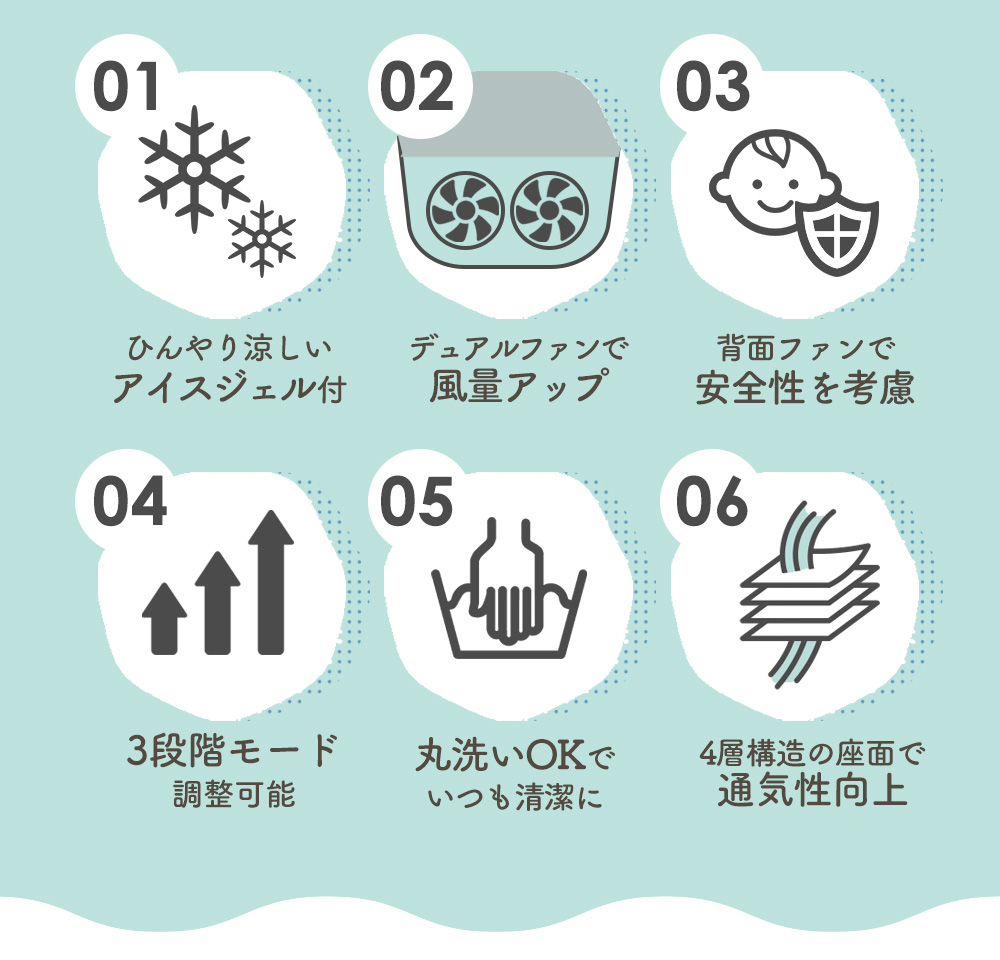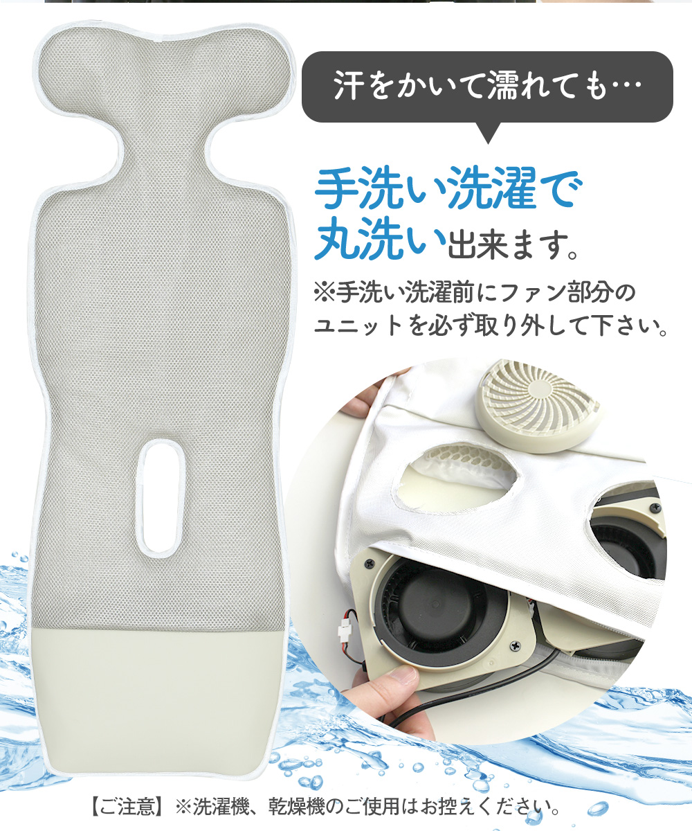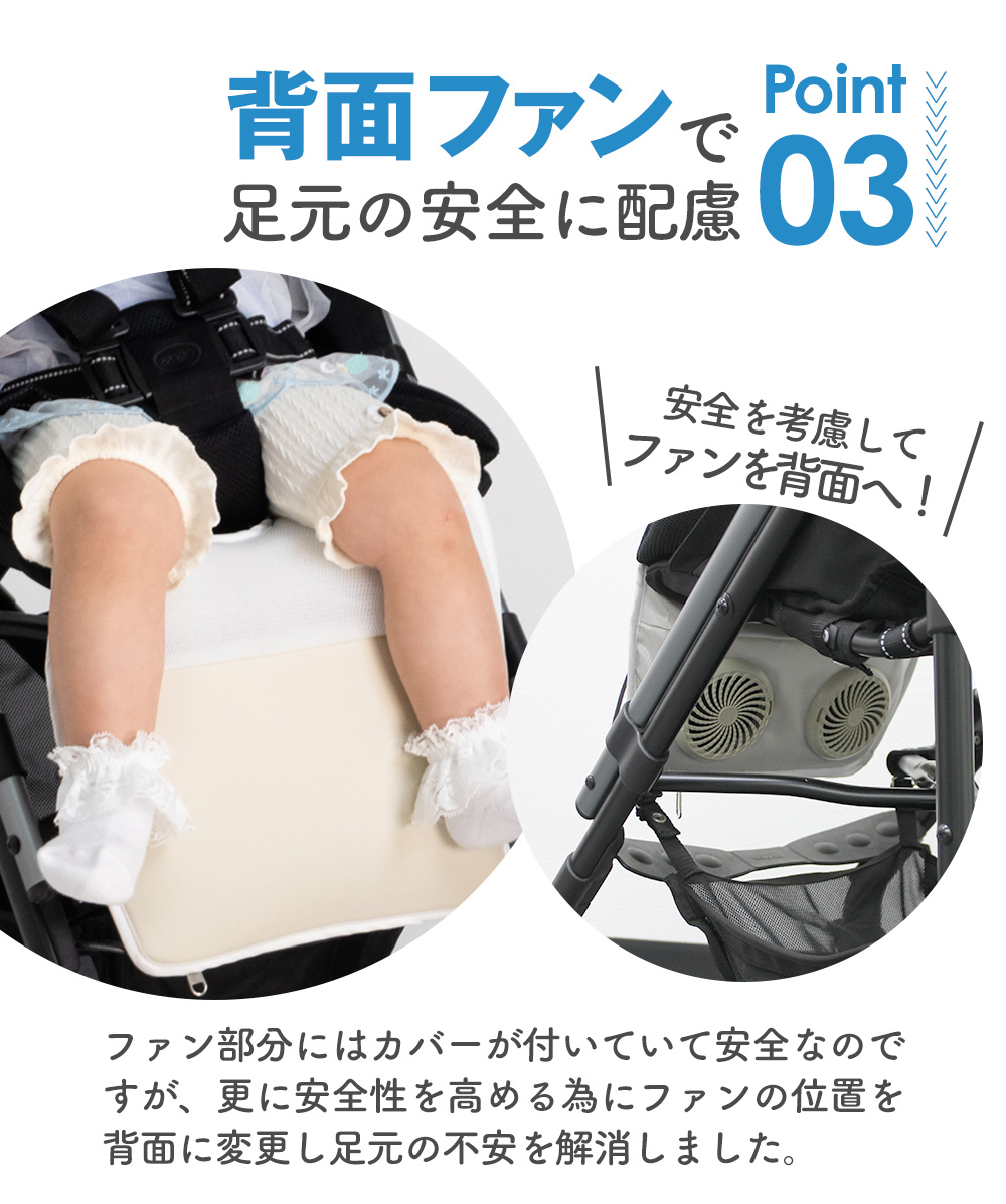 電動ファンで空気を透過させて赤ちゃんの座る座面を涼やかにし、モバイルバッテリーで作動可能なので外出時などどこでも使えます。