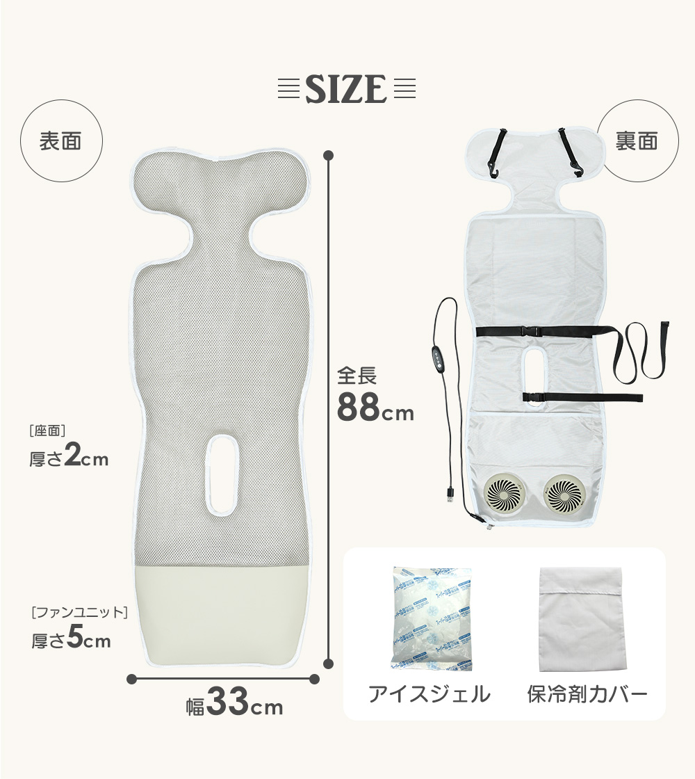 ■サイズ(約):シート本体/幅33cm×全長88cm×厚さ2cm(ファンユニット部分5cm)