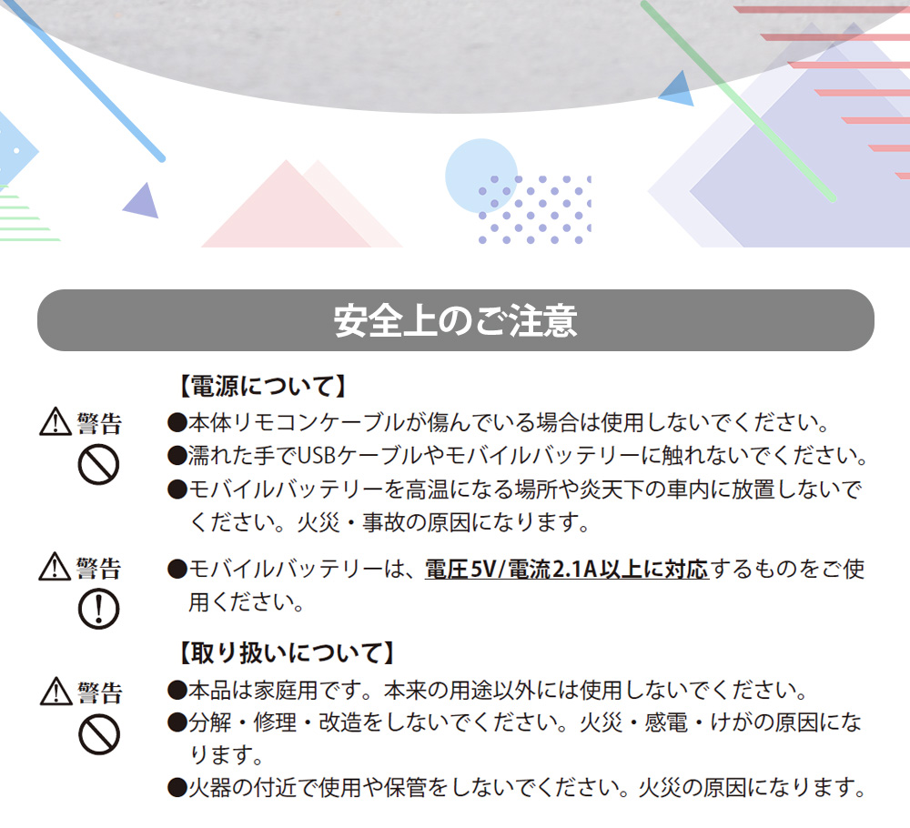 ※ 本製品の推奨バッテリーは、5V出力・最大3AまでのUSB充電器やモバイルバッテリーです。