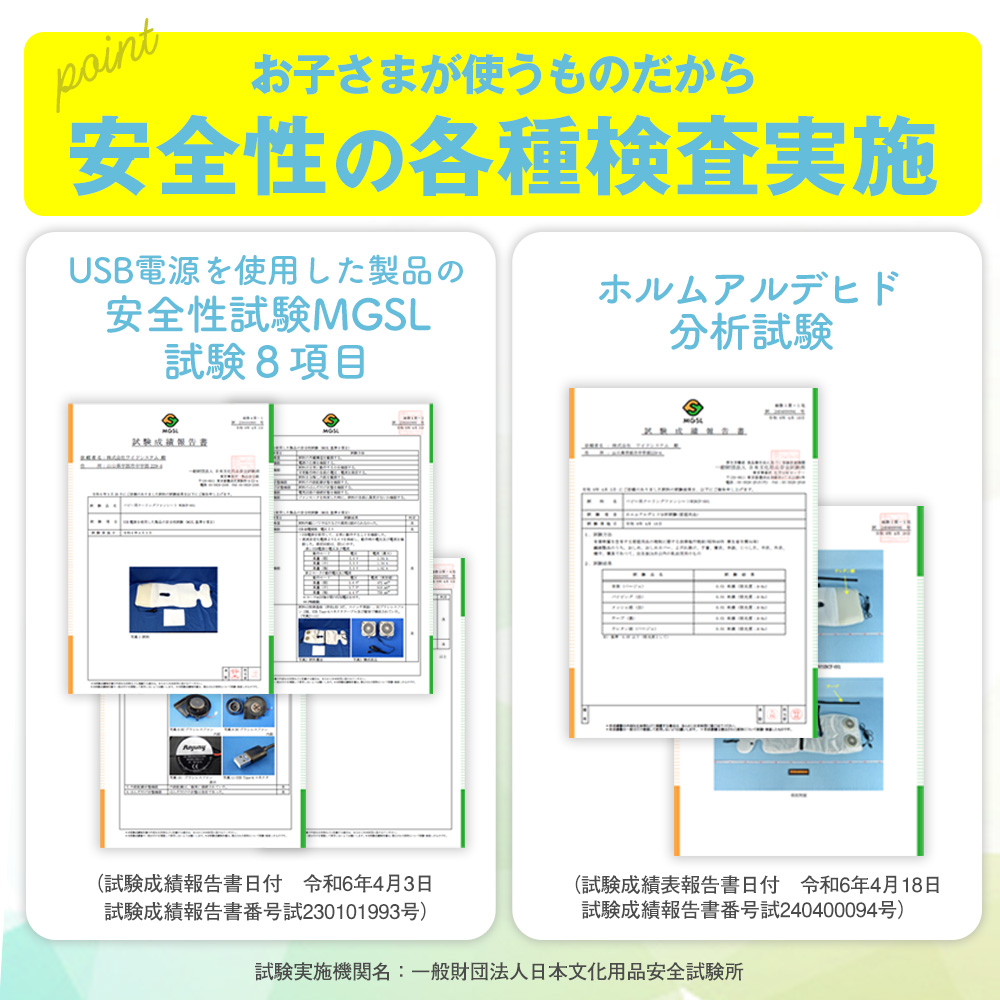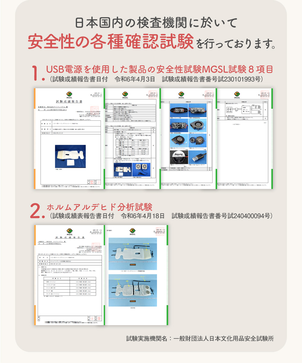赤ちゃん 0歳 1歳 2歳 3歳 4歳 5歳 ホルムアルデヒド お出かけ 安全性試験 MGSL 8項目 cool Fan sheet for baby