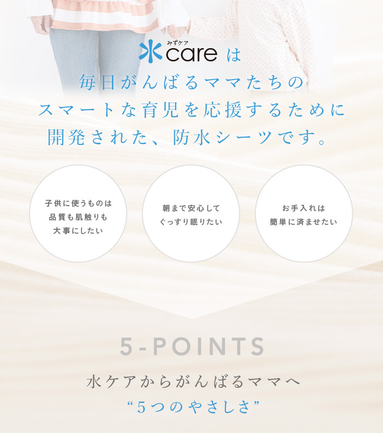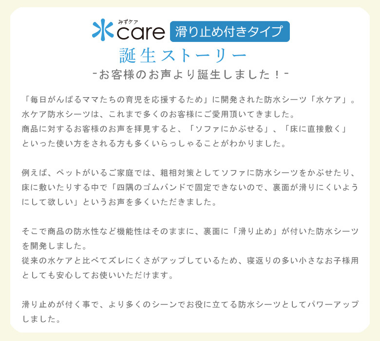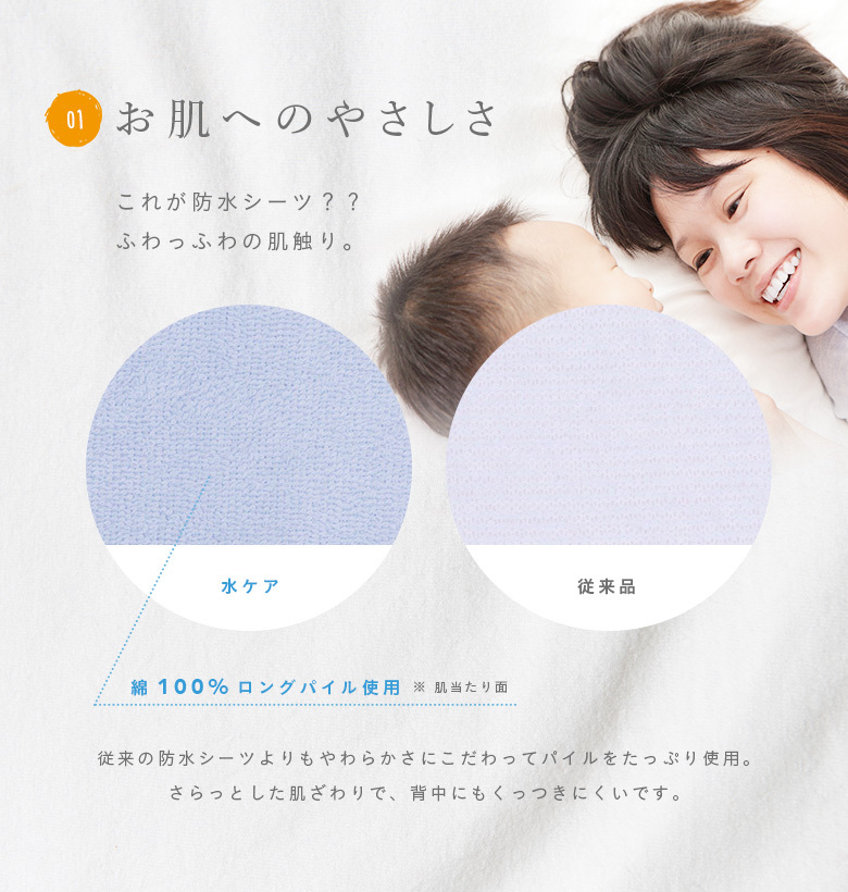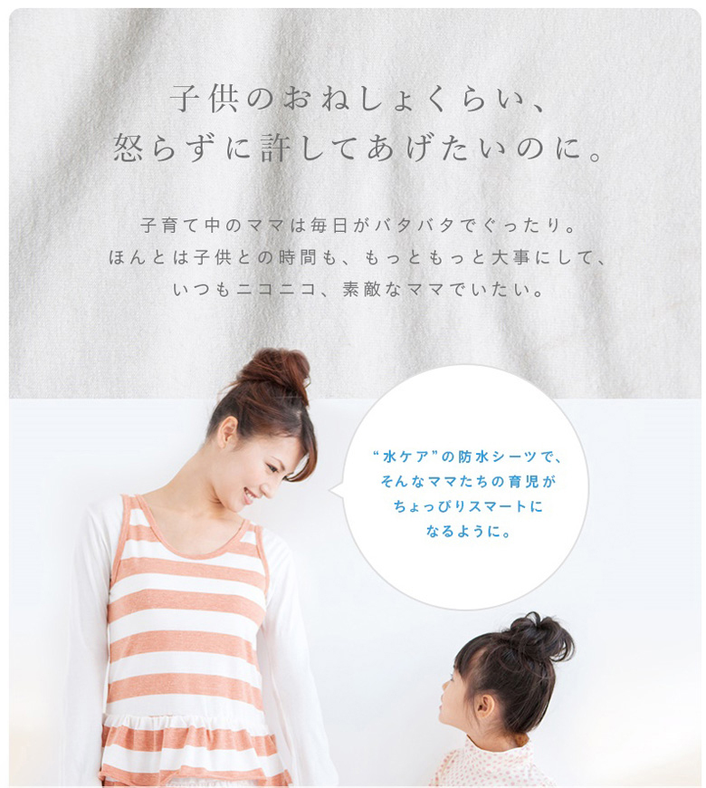 当店の人気商品である防水シーツが2017年3月29日「水Care(みずケア)」シリーズとしてリニューアルしました。多くの防水シーツは「肌触りがゴワゴワする」「乾燥機が使えないからお手入れが大変」「蒸れてしまわないか?」と困っている声が多く聞かれました。