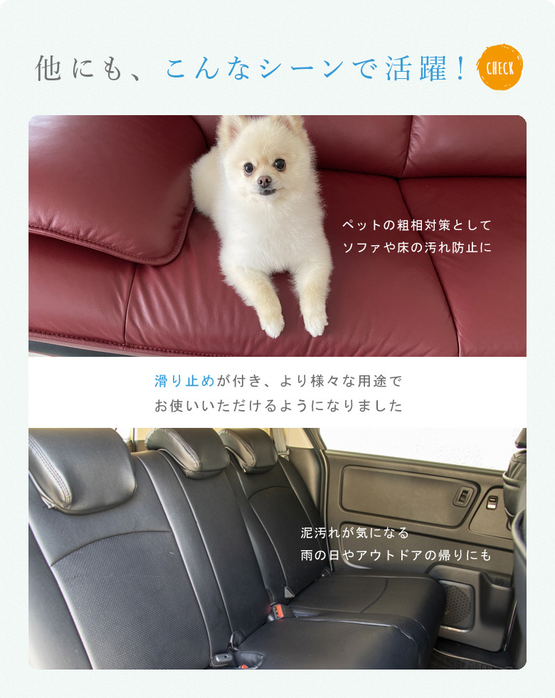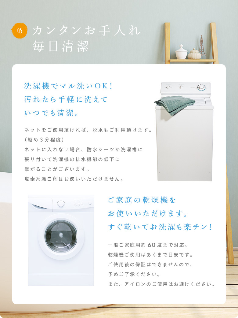 防水シーツは時間や天気関係なく、いつも突然汚れてしまいます。だからこそすぐに清潔に出来るよう、洗濯機・乾燥機を使えるように開発しました。