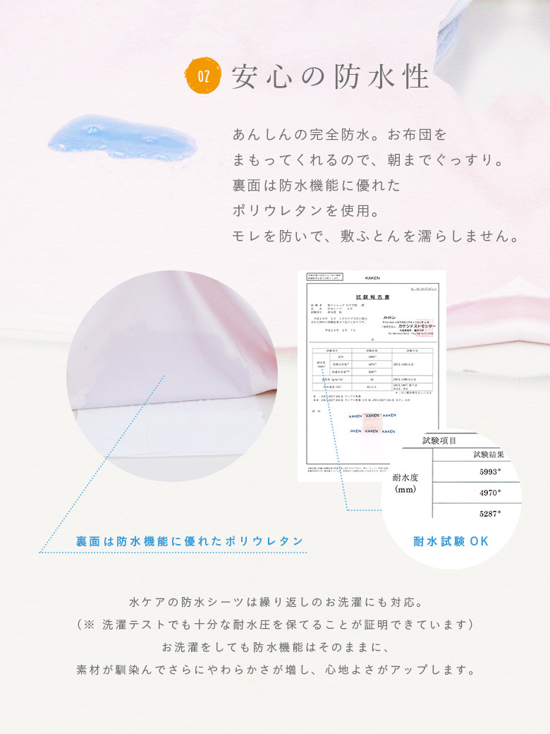 当店オリジナル 水ケア防水シーツはパイル地の柔らかさやカラーにもこだわり、きちんとした検査機関で透湿性(蒸れにくさ)、耐水性、ホルマリン試験を行うことで、お子様のトイレトレーニング、介護、ペットの粗相など幅広い用途でも、安心、安全、快適にお使いいただけます。