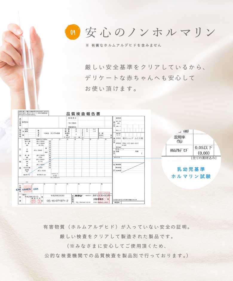 厳しい安全基準をクリア。赤ちゃんにも使うからこそ、ママ・パパが安心して使えるように、有害なホルムアルデヒドを含まないことを公的検査機関で検査、証明しました。