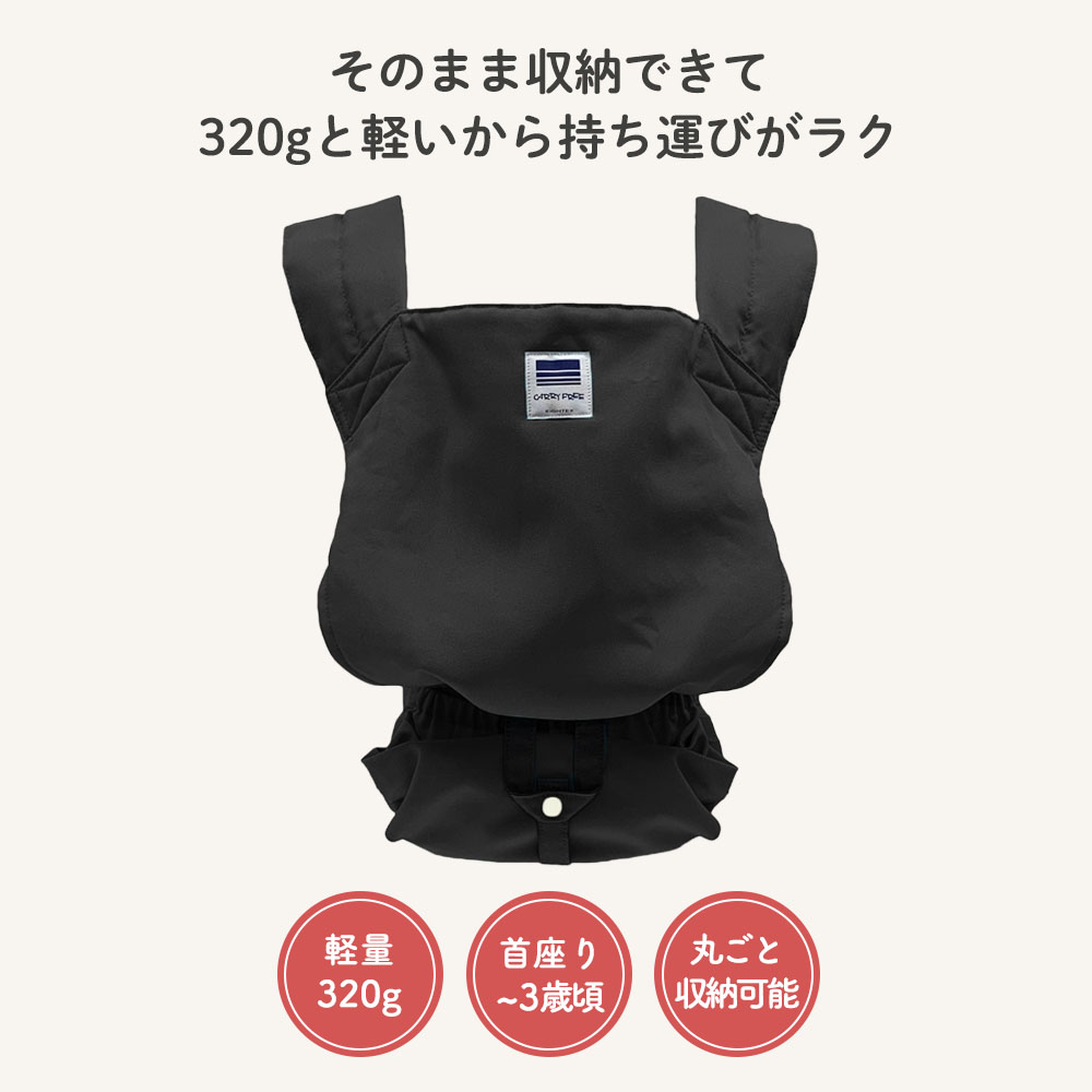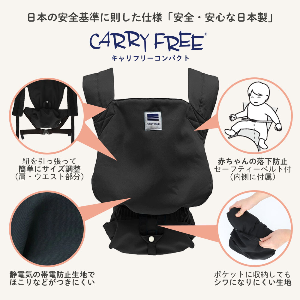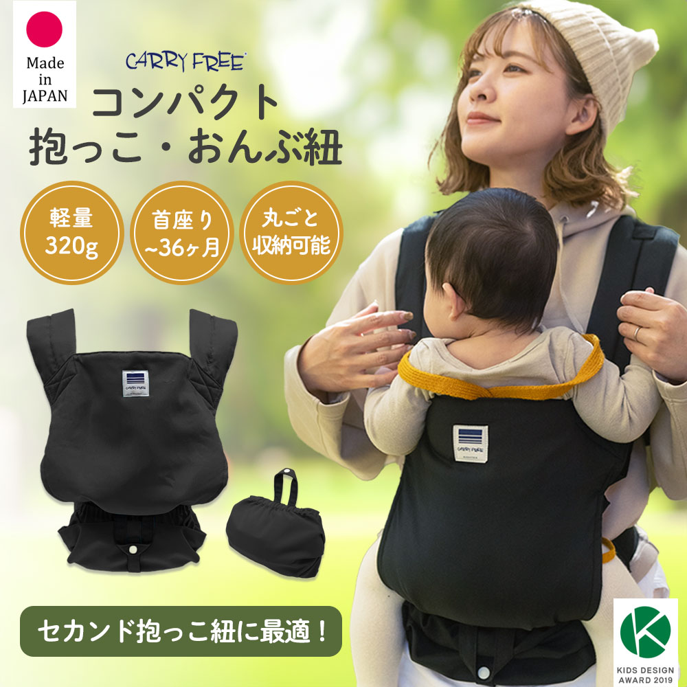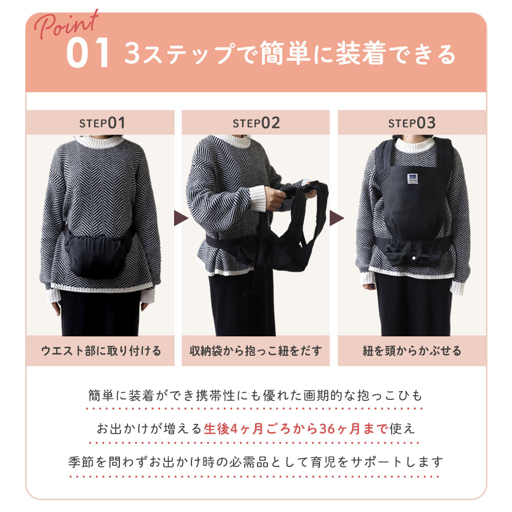 赤ちゃんとの外出は何かと荷物が多くなりがち。ベビーカーだけではぐずった時に不安だけど、普段使っている抱っこひもはかさばるし装着が面倒…。そんなママたちのお悩みを解消する抱っこひも、その名も「キャリフリー コンパクト」です。簡単に装着ができ携帯性にも優れた画期的な抱っこひもで、製品安全協会認定のSGマーク付き。お出かけが増える生後4ヶ月ごろから36ヶ月まで使え、季節を問わずお出かけ時の必需品として育児をサポートします。抱っことおんぶができる腰ベルトタイプの抱っこひもです。外出中に赤ちゃんが抱っこやおんぶをせがんだ時でも簡単3ステップで装着ができます。また、急いでいてもクルっと簡単に収納できます。くるくると本体を収納できるポケット付きで、入れ込むだけで素早く収納可能。綺麗に畳まなくても平気なようにシワになりにくい生地を採用することで、急いでいる時でも手間取りません。使わない時はポケットに丸ごと収納することで、マザーズバッグに入れてもベビーカーに乗せてもかさばらないコンパクトサイズに変化。ベビーカーのフックにぶら下げられるストラップ付きで利便性も抜群です。