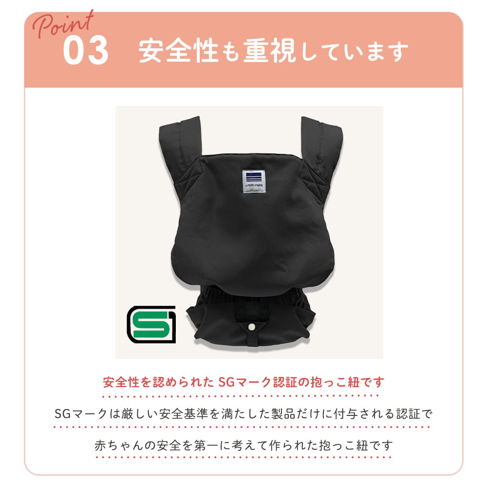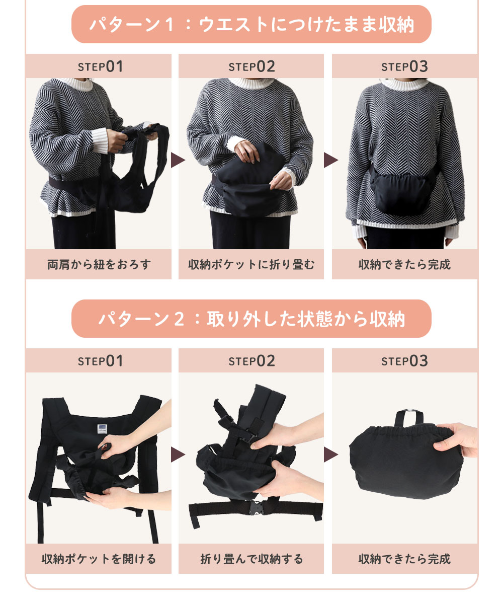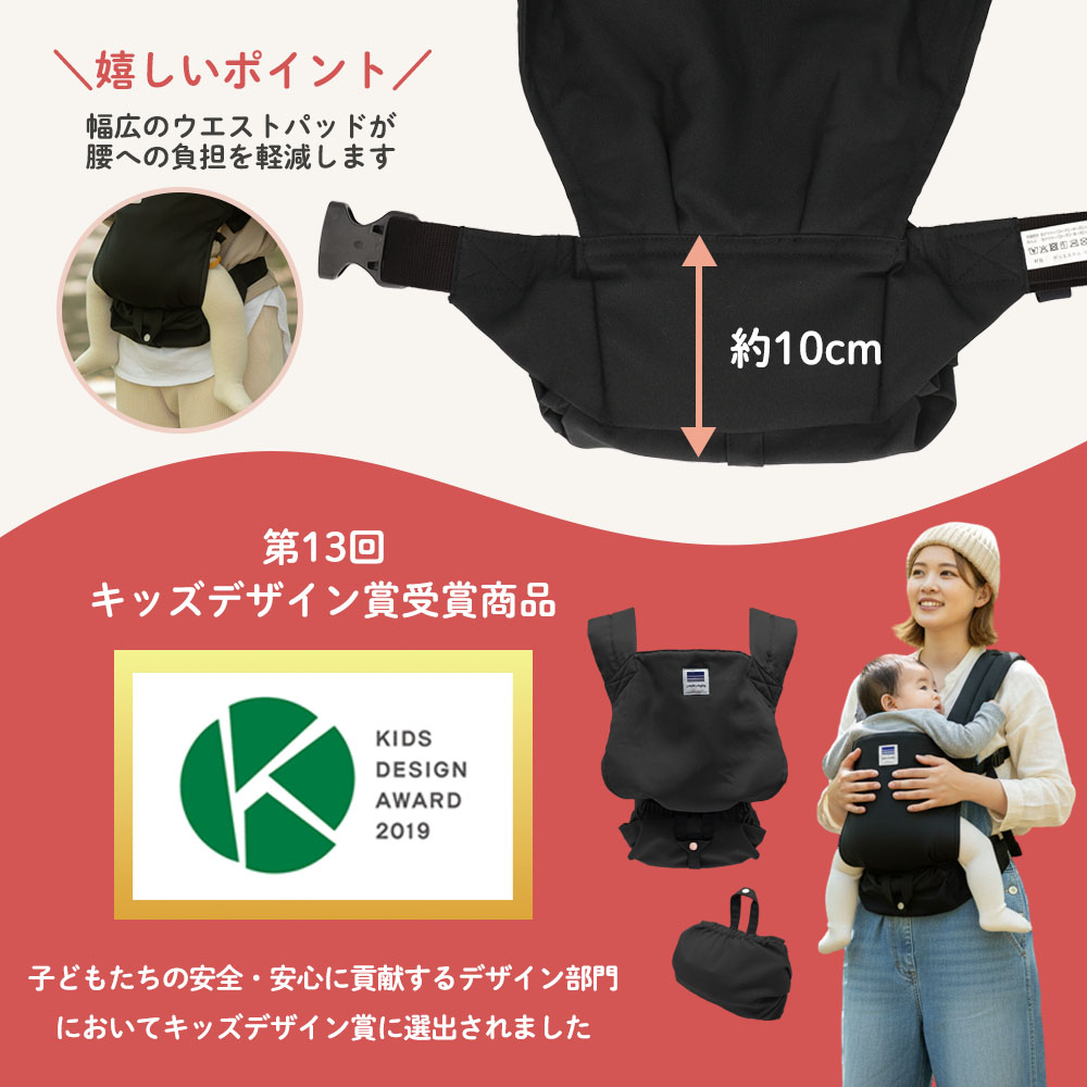 赤ちゃんとの外出は何かと荷物が多くなりがち。ベビーカーだけではぐずった時に不安だけど、普段使っている抱っこひもはかさばるし装着が面倒…。そんなママたちのお悩みを解消する抱っこひも、その名も「キャリフリー コンパクト」です。簡単に装着ができ携帯性にも優れた画期的な抱っこひもで、製品安全協会認定のSGマーク付き。お出かけが増える生後4ヶ月ごろから36ヶ月まで使え、季節を問わずお出かけ時の必需品として育児をサポートします。抱っことおんぶができる腰ベルトタイプの抱っこひもです。外出中に赤ちゃんが抱っこやおんぶをせがんだ時でも簡単3ステップで装着ができます。また、急いでいてもクルっと簡単に収納できます。くるくると本体を収納できるポケット付きで、入れ込むだけで素早く収納可能。綺麗に畳まなくても平気なようにシワになりにくい生地を採用することで、急いでいる時でも手間取りません。使わない時はポケットに丸ごと収納することで、マザーズバッグに入れてもベビーカーに乗せてもかさばらないコンパクトサイズに変化。ベビーカーのフックにぶら下げられるストラップ付きで利便性も抜群です。