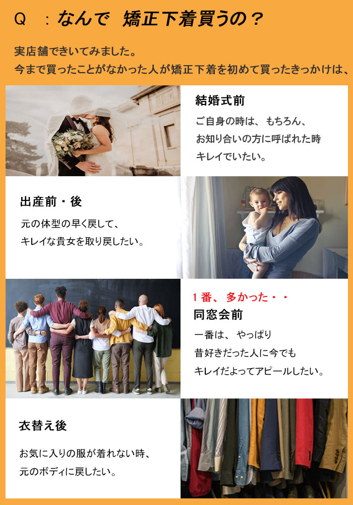 A.よくお聞きするのは、この質問です。スタイルに自信のある方には、必要ありませんが、地球上に重力というものがあるので、多くのものは、落ちてくる、もしくは、垂れさがってきます。急にスタイルをよくしなくてはいけないっシチュエーションが遭遇した時、履き始めたといった状況が多いです。特に、多いシチュエーションは・・・(実店舗で聞いてみました。)