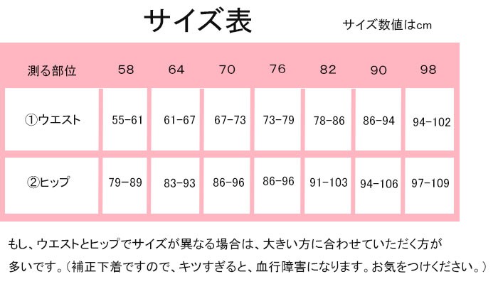 例えば、ウエストW64に近いサイズの方であっても、きつく締める方がお好きな方であればW64をお選びください。また、きつく締めすぎるのが、苦手という方は、ワンサイズ上のW70をお選びください。